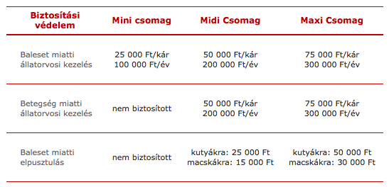 Például: Ha Midi csomagot köt kutyájára, és több baleset is éri egy biztosítási évben kutyáját, akkor egy balesetből eredően az állatorvosi kezelésre maximum 50 000 Forint kerül kifizetésre, és éves szinten pedig maximum 200 000 Forint.